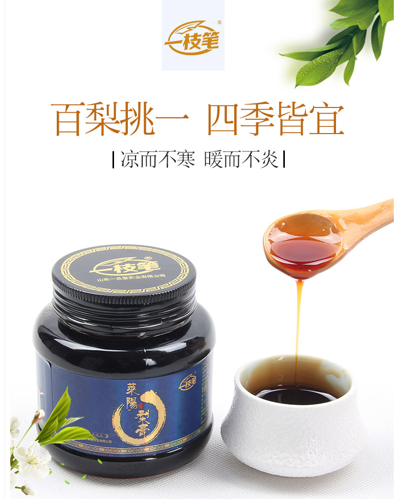 一枝笔莱阳梨膏采用100%莱阳梨熬制,不含任何添加剂,采用先进的40度低温熬制技术,最大程度保留住莱阳梨中营养,一枝笔莱阳梨膏使用九炼九滤熬炼工艺,经挑、选、切、碾、熬、搅、滤,七道工序全程不加一滴水遵古法熬制, 20斤莱阳梨细熬15小时才能制出一斤梨膏,足以见其醇厚。如此制作而成的梨膏丝毫无杂质,色泽深沉透亮,莱阳梨膏闻起来有柔和的香气,膏体饱满、遇纸不吸、聚而不散、不晕不化。确实做到原浆原膏,原汁原味。